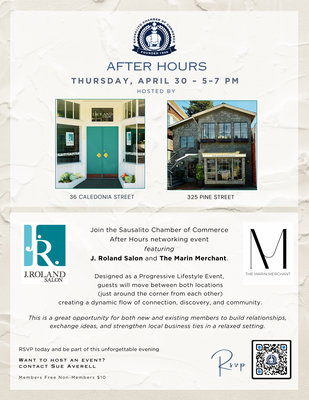 Join the Sausalito Chamber of Commerce for an engaging After Hours networking event featuring J. Roland Salon and The Marin Merchant. Designed as a Progressive Lifestyle Event, guests will move between both locations—just around the corner from each other—creating a dynamic flow of connection, discovery, and community.